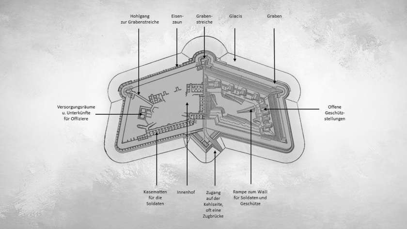 Das gesamte Fort war umgeben von einem tiefen Graben, in dem Verteidigungsstellungen vorhanden waren, um die Sturmfreiheit zu unterstützen.