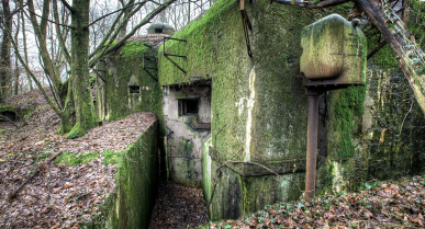 Leider kann ich Dir vorerst nur Bilder von den Kampfblöcken 1 und 2 zeigen – jeweils nur die Außenansicht. Ich schaute mir zwar den Block 2 auch im Inneren an, dieser ist jedoch komplett geräumt. Da gab es für mich nichts, was ich fotografieren wollte. Im Block 1 sollen noch Einrichtungsgegenstände zu finden sein – wenn man jedenfalls Schilderungen früherer Besuchern Glauben schenkt. Doch bei meinem Besuch war ein Zugang zum Block 1 nicht möglich. Es führte lediglich ein schmales und wegen des starken Regens sehr glitschiges Brett über den Diamantgraben. Ich wollte nicht das Risiko auf mich nehmen, auf diesem auszurutschen und mir die Anlage aus Bodenperspektive einige Meter tiefer anzusehen. Ein Besuch des Inneren hole ich später nach.
