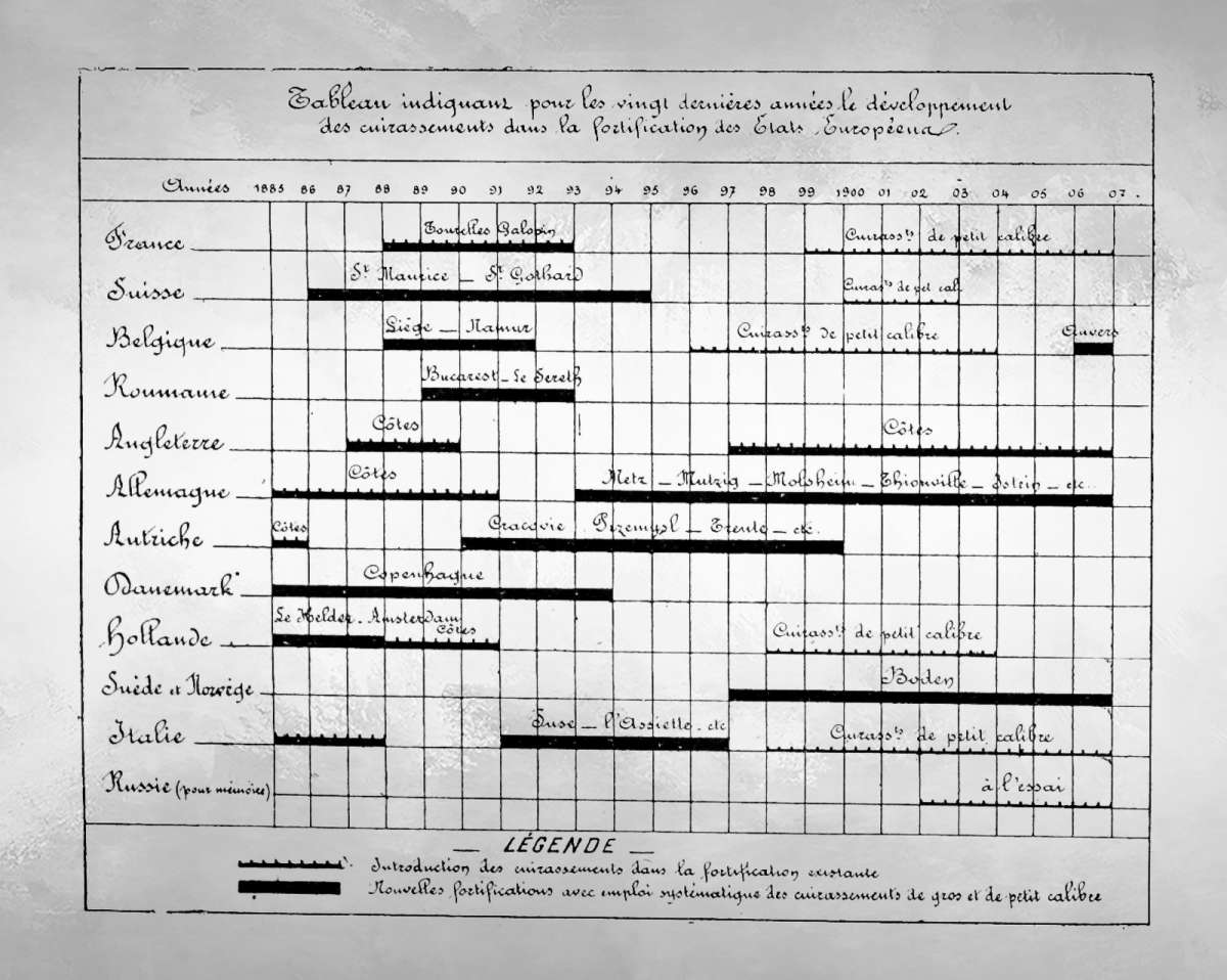 Die nachfolgende Übersicht gibt einen Einblick in die beiden zuvor beschriebenen Phasen. Man sieht, dass das Deutsche Kaiserreicht relativ schnell auf die sich veränderten Rahmenbedingungen reagierte und bereits in den 1890er-Jahren mit dem Bau sogenannter Panzerfestungen begann. .Einen Prototyp findet man heute in Thorn (Polen). Die Feste König Wilhelm I. mit seinen wuchtigen 21-cm-Turmkanonen mit Panzerung gilt als Vorläufer eines neuen Festungstyps, den die Deutschen als "Feste" bezeichneten. Kurz darauf wurde mit dem Bau der Feste Kaiser Wilhelm II. bei Straßburg im Elsass begonnen. Sie stand Modell vielen anderen Festungen, die im darauffolgenden Jahrzehnt errichtet wurden.