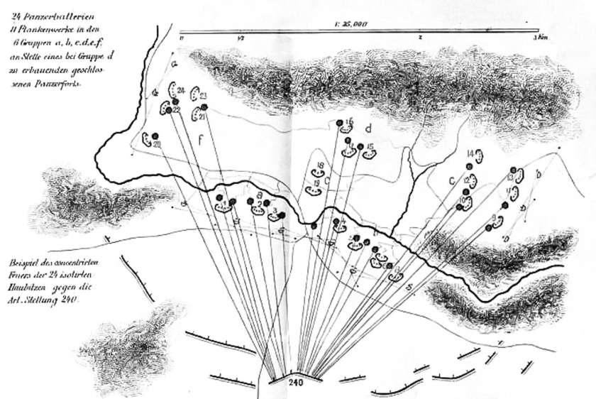 Kurzum: Jede Feste einzeln und mehrere zusammen konnten mehrere oder geballt einzelne Punkte gezielt bekämpfen, weil sie ihre Feuerkraft bündelten. In der damaligen Literatur spricht man bei letzterem gern von "Massenfeuer". Ein Rechenbeispiel: Wenn zehn Haubitzen (ggf. mehrerer Panzerfestungen) ihr Feuer bündeln, hat man für die Dauer von einer Minute gut einhundert Schuss. Im Gegensatz dazu mussten feindliche Truppen gleichzeitig viele Positionen bekämpfen, um diese Geschütze auszuschalten.