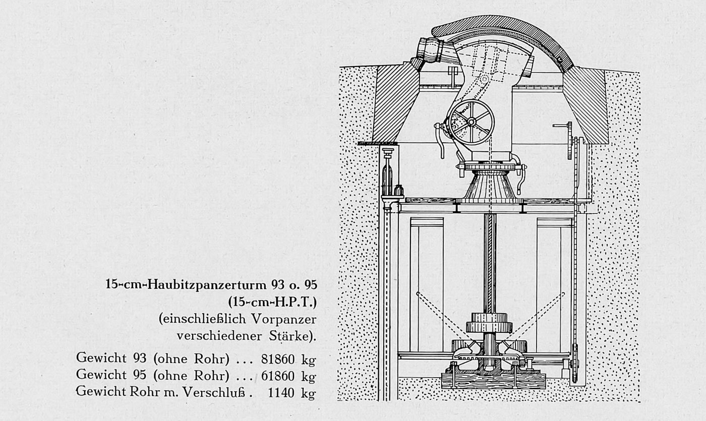 Bei den vier Panzerkuppen handelt es sich um das Modell 93 - gefertigt im Magdeburger Grusonwerk, welches später von Krupp übernommen wurde. Die Haubitzen können zwei Schuss pro Minute abgeben und bei einem Neigungswinkel von 18 bis 32 Grad sogar vier. Ihre Reichweite betrug bis zu 7.200 Meter. Die Besatzung jeder Kuppel bestand aus einem Unteroffizier und vier Kanonieren.