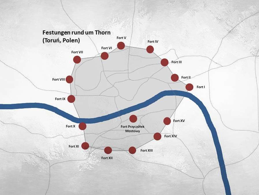 Toruń (ehemals Thorn) liegt in Polen und war einst eine der großen Festungsstädte des deutschen Kaiserreichs in Westpreußen. Die an der Weichsel liegende Stadt verfügte gegen Ende des 19. Jahrhunderts über ein mächtiges Befestigungssystem und sicherte die damalige Ostgrenze des Kaiserreichs zu Russland - diese war lediglich 10 Kilometer entfernt. Thorn galt als wichtiger Verkehrsknotenpunkt und im Fall eines Krieges mit dem östlichen Nachbarn ein zentral gelegener Angriffspunkt.