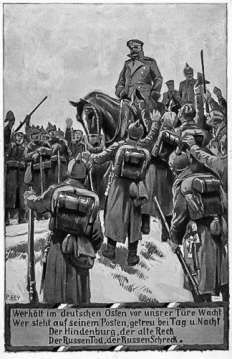 Gleich zu Beginn des Weltkrieges - also im Spätsommer 1914 - wurde General Paul von Hindenburg zum Kriegsheld stilisiert. Der "Sieger von Tannenberg" war für die Propaganda ein gefundenes Fressen. Man hatte eine Leitfigur, die man ins Zentrum stellen konnte und man machte reichlich Gebrauch davon. Man bediente damit den Sehnsucht der Deutschen nach Größe, Erfolg, Schutz und Heldentum. Letzteres war wichtig. Man hatte mit Hindenburg eine Identifikationsfigur, die es auszuschlachten galt. Später drehte sich dies. Es gab nur wenige Heerführer, die die Rolle Hindenburgs in der Propaganda übernehmen konnten. Also wendete man sich dem einfachen, namenlosen Frontsoldaten zu. Um seinen Mut und seinen Einsatz zu unterstützen, wurden die Menschen in Deutschland aufgefordert, Kriegsanleihen zu zeichnen, so dass jeder seinen finanziellen Anteil tragen bzw. ein finanzielles Opfer für den erwarteten Sieg leisten kann.