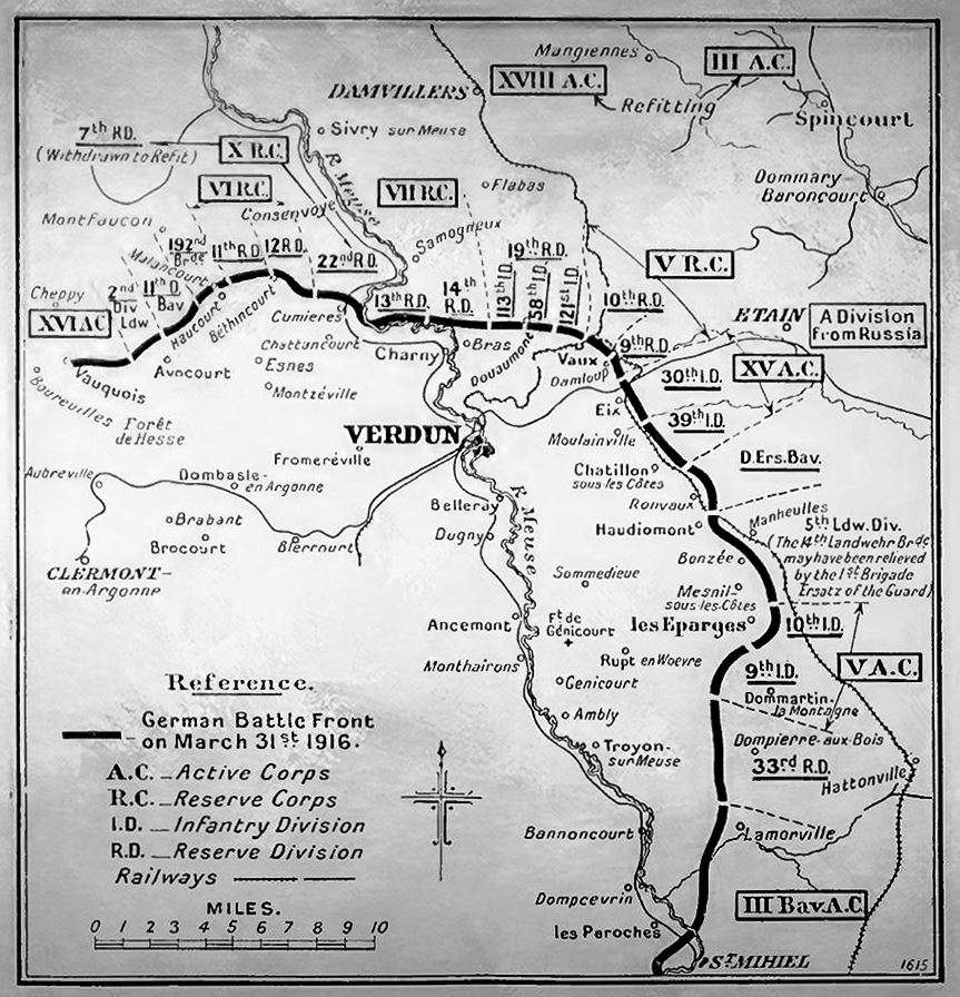 Auf Befahl Ludendorffs wird der deutsche Angriff auf Verdun wegen fehlender Erfolgsaussichten eingestellt. Dieses betrifft allerdings nur die Frontabschnitte östlich von Verdun. Am linken Maas-Ufer - also nordwestlich von Verdun - wird weiter um die Höhe 304 und der "Tote Mann" gerungen. Die Karte zeigt den Kriegsverlauf von April bis September 1916.