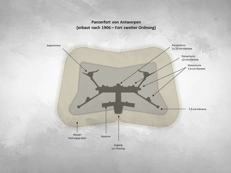 Zum Schutz der belgischen Metropole Antwerpen wurden zu Beginn des 20. Jahrhunderts weit vor den Toren der Stadt zahlreiche Panzerfestungen errichtet. Man unterschied dabei Werke erster und zweiter Ordnung (letzteres ist hier dargestellt). Diese Festungen verfügten scheinbar über alle Merkmale einer modernen Panzerfestung. Sie hatten nur einen riesigen Schwachpunkt: Der Beton wurde nicht bewehrt, was sich während des Ersten Weltkriegs als riesiger Nachteil herausstellte.