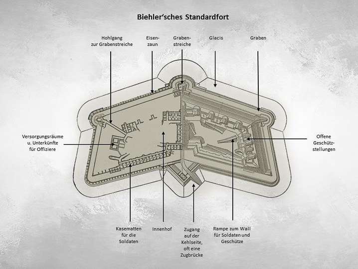 Die einzelnen Forts des zweiten Walls plante man mit einem Abstand von circa fünf Kilometer zueinander. Eine Entfernung, die es erlaubte, dass sich die Festungen im Fall eines Angriffs gegenseitig decken konnten. Bis auf wenige Ausnahmen orientierte man sich beim Bau an den sog. Biehlerschen Einheitsfort. Das war eine Blaupause für eine schnelle, kostengünstige Errichtung moderner Festungsanlagen. Ähnliche Forts findet man beispielsweise auch rund um Köln oder eines von Ihnen auch bei Metz (Fort Manstein).