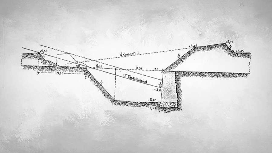 Der Graben war bei den Biehler-Forts im Regelfall 9 Meter breit - erreichte aber auch bei einigen Festungen eine Breite von bis zu 11 Metern. Und er war mindestens 6,5 Meter tief - es gibt Festungen, bei denen er sogar eine Tiefe von 9 Metern hatte.