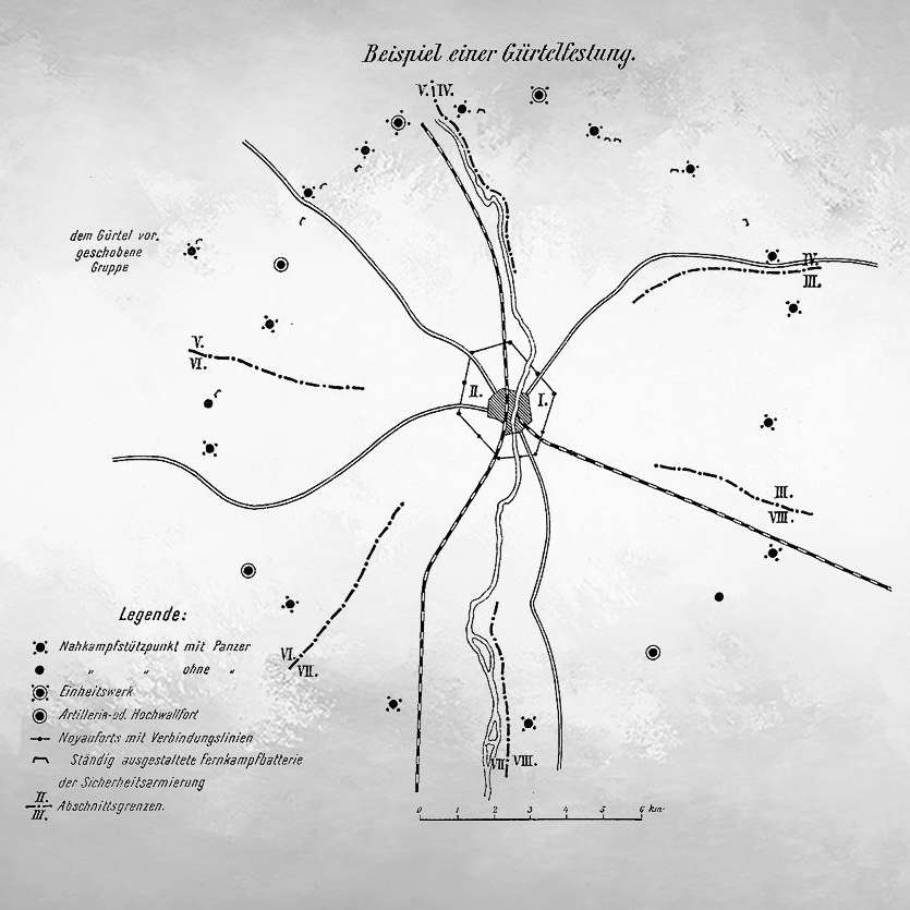 Quelle: Artillerieunterricht für die k. u. k. Festungsartillerie, VI. Teil Einrichtung der beständigen Befestigungen. Kuk-Hof- und Staatsdruckerei, 1914
